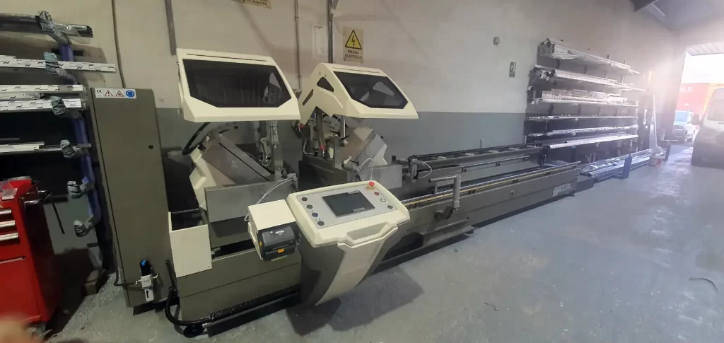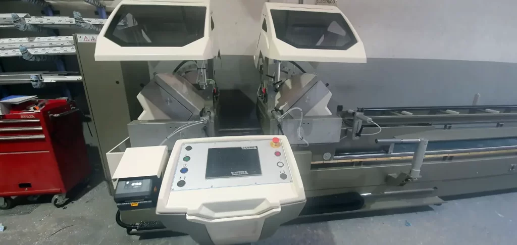 Instalación de una doble cabezal para el corte de perfiles de pc disco cuatrocientos cincuenta milímetros marca Intelli machInstalación de una doble cabezal para el corte de perfiles de pc, disco cuatrocientos cincuenta…