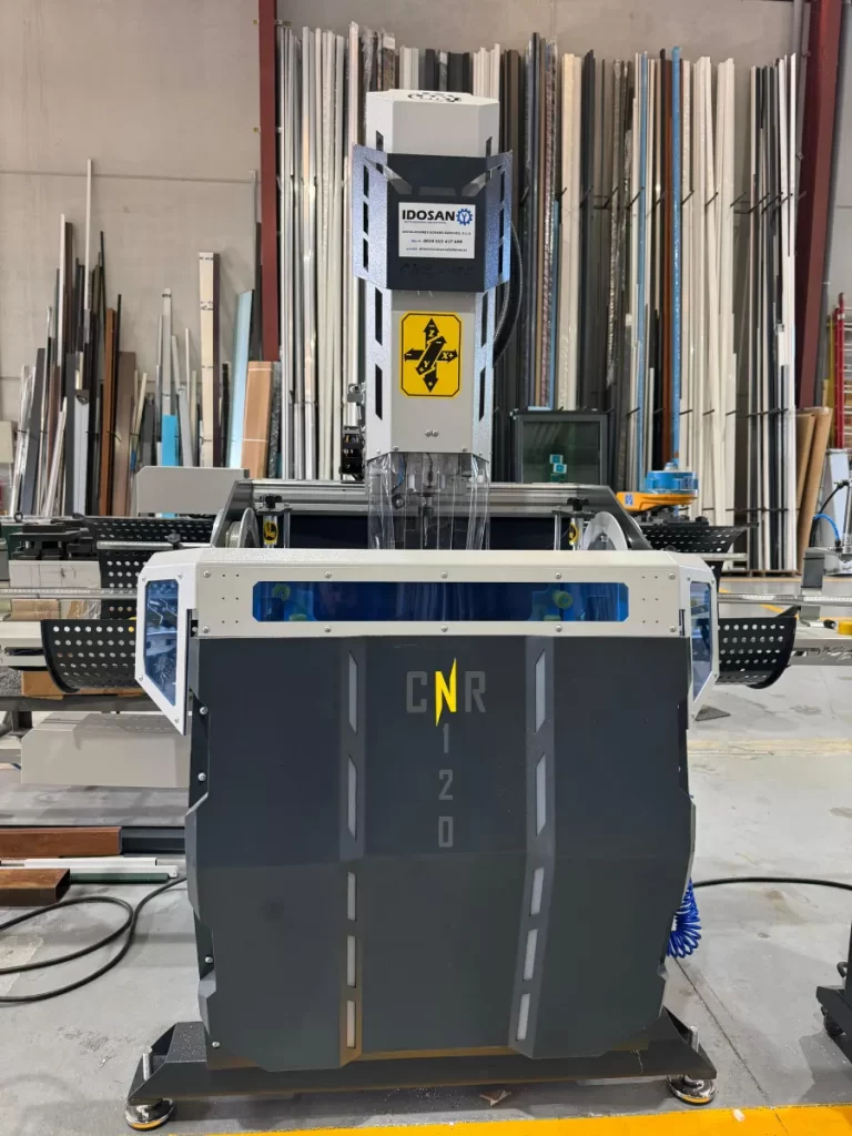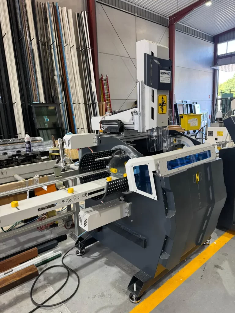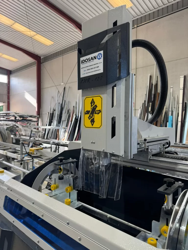 Instalación de una doble cabezal para el corte de perfiles de pc disco cuatrocientos cincuenta milímetros marca Intelli machInstalación de una doble cabezal para el corte de perfiles de pc, disco cuatrocientos cincuenta…